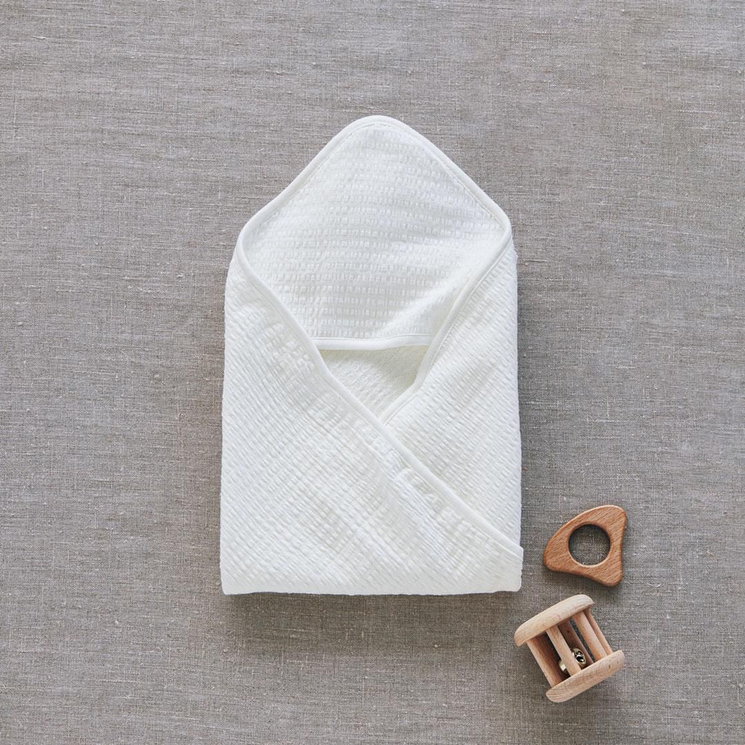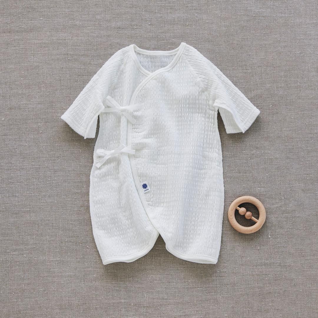 40単糸の細番手で織り込んだガーゼパイルを使ったベビーウェアは、しなやかで伸縮性に優れ、赤ちゃんの動きをしっかりとキャッチする「肌感覚」に近い仕上がり。表面のガーゼには、シアサッカー(しじら織り)のような縞模様の凹凸があり、熱を逃してくれる効果があります。パイル面は吸水性、ガーゼ面は速乾性と通気性を発揮させ、体温の高い赤ちゃんの快適さをとことんまで追求しました。